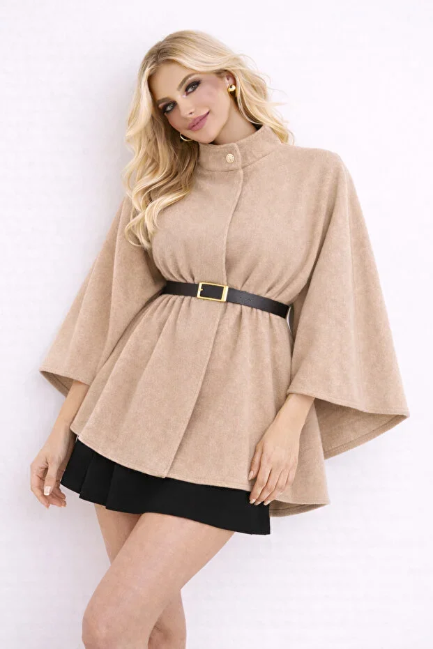 Kışlık kaşe kumaşının sıcaklığı ve dayanıklılığı bu parçada bir araya geliyor. Kalın kaşe dokusu, rüzgarlı havalarda üşümeyi minimize ederken aynı zamanda bedene hafifçe sarılarak zarif bir siluet yaratır. İç kısmında yumuşacık astar bulunur; hareket ederken size konfor sunar ve gün boyu rahat bir his verir. Bej rengi, ışıkla birlikte sıcak tonlarda parlar ve her türlü alt giysiyle uyum sağlar. Pançonun kazandırdığı hacimli ama zarif görünüm, beden hattını natürel bir şekilde vurgular ve genel görünümünüzü tamamlar.