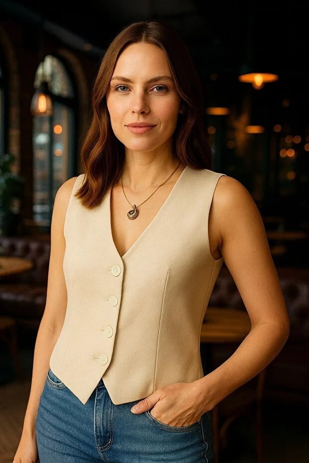 Kadın Bej Astarlı Yelek – Slim Fit Kesim ile Klasik ve Modern Zarafet