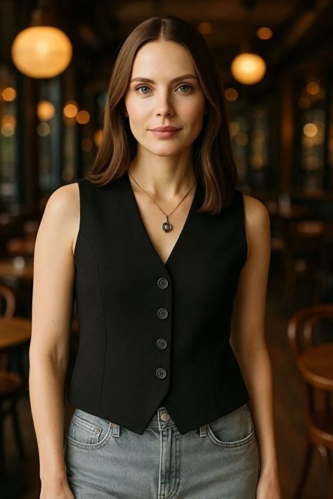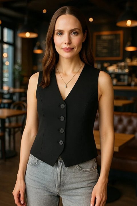 Siyah renk; modası asla geçmeyen, her stile uyum sağlayan ve güçlü bir duruş sunan en zamansız renklerden biridir. Bu yelek, sade ama iddialı tasarımı sayesinde tek başına şık bir üst olarak kullanılabileceği gibi, gömlek, bluz veya ceketlerle birlikte katmanlı kombinler için de ideal bir parçadır. Astarlı yapısı sayesinde formunu korur ve gün boyu düzgün bir duruş sağlar.